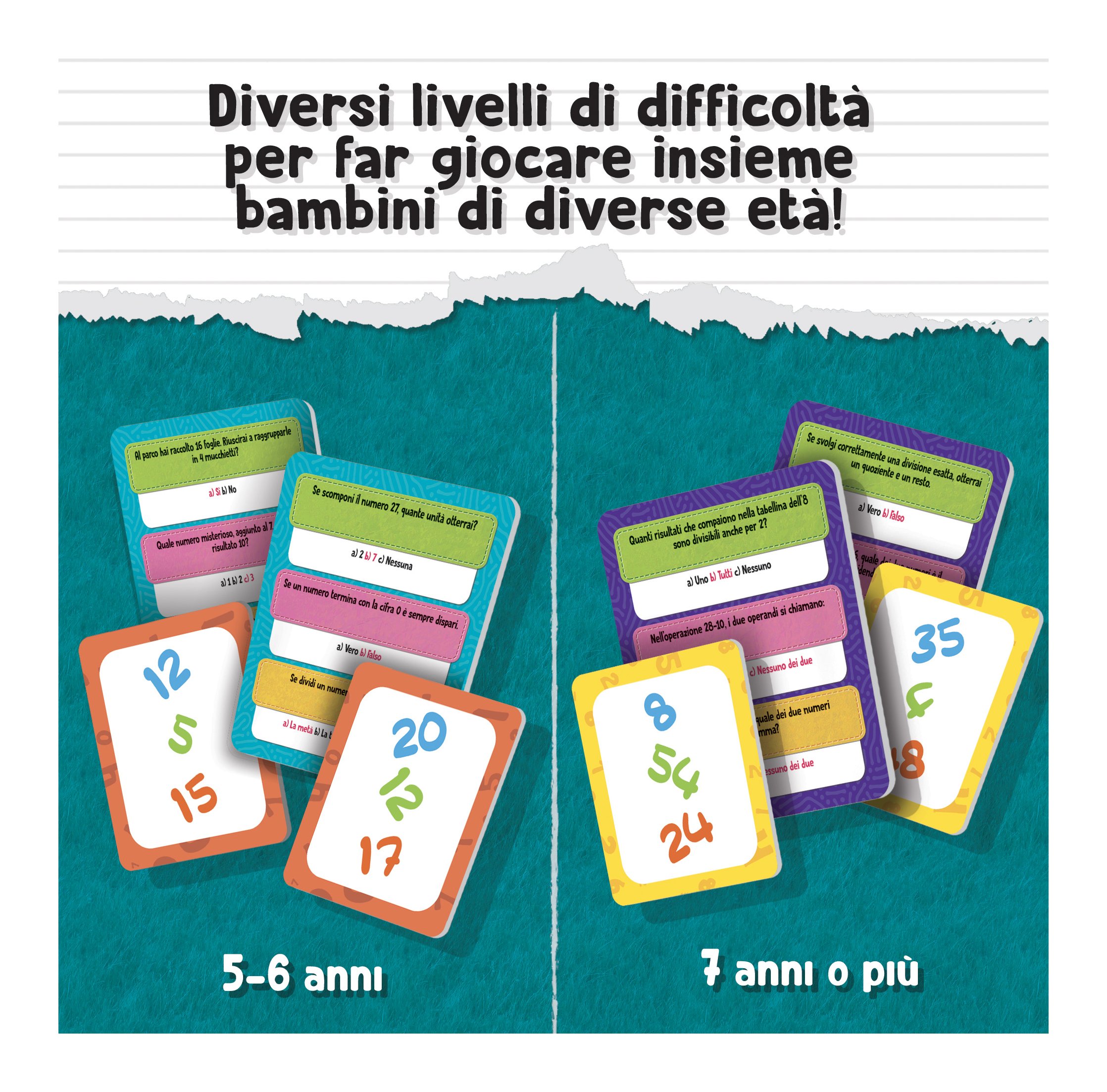 Un gioco di percorso a quiz, basato sui programmi della scuola primaria, per imparare l’aritmetica. Grazie ai tre livelli di difficoltà, possono giocare insieme bambini di età diversa. Risolvi i divertenti problemini, supera le prove con le tabelline. Include 1 plancia di gioco - 1 spinner - 16 gettoni tondi - 12 coccarde - 27 carte speciali - 4 birilotti