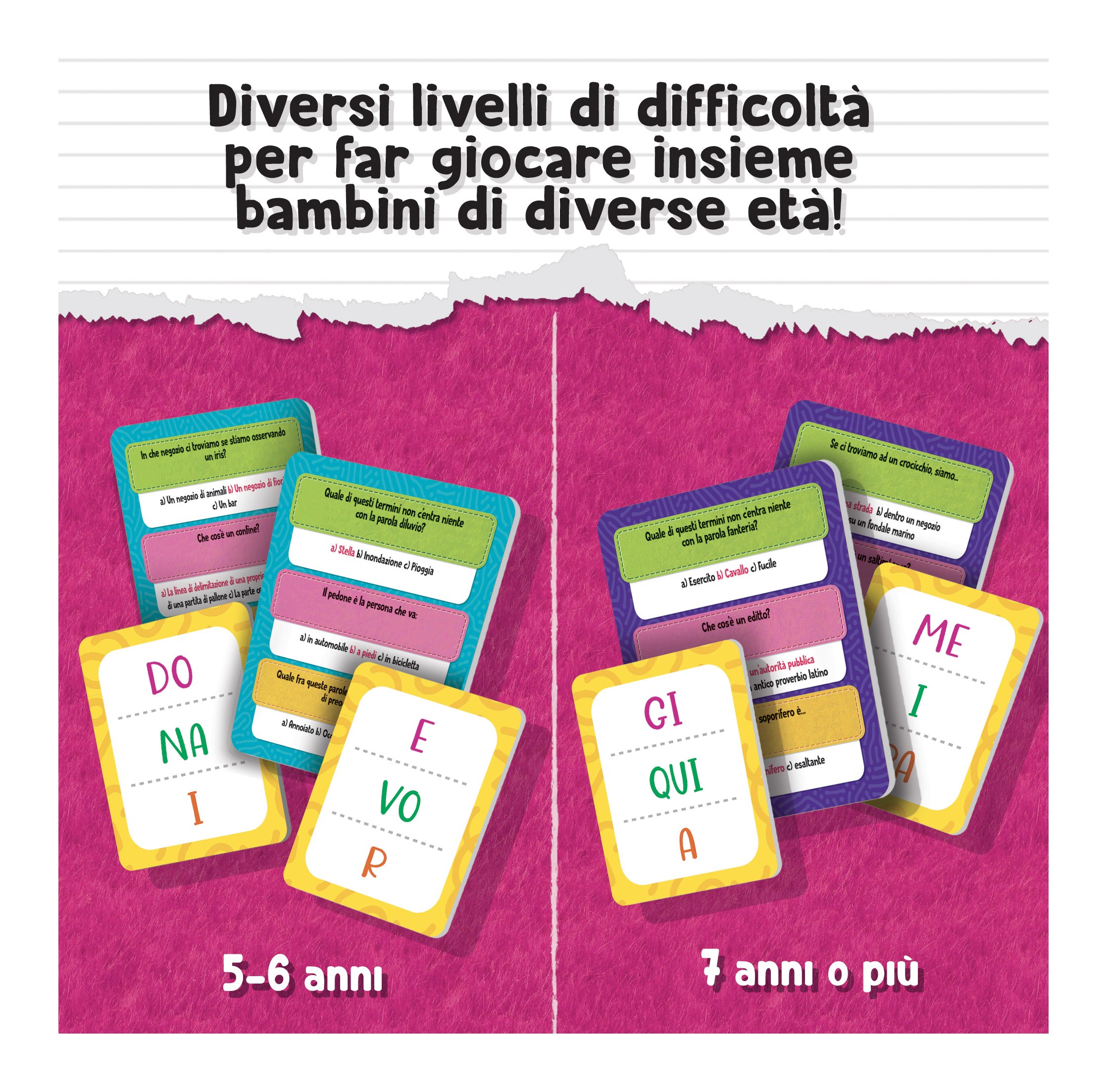Un gioco di percorso a quiz, basato sui programmi della scuola primaria, per sviluppare il lessico e la conoscenza della lingua italiana. Grazie ai tre livelli di difficoltà, possono giocare insieme bambini di età diversa. Rispondi alle divertenti domande. Include 1 plancia di gioco - 4 birilotti - 1 spinner - 48 carte quiz - gettoni e coccarde - carte speciali