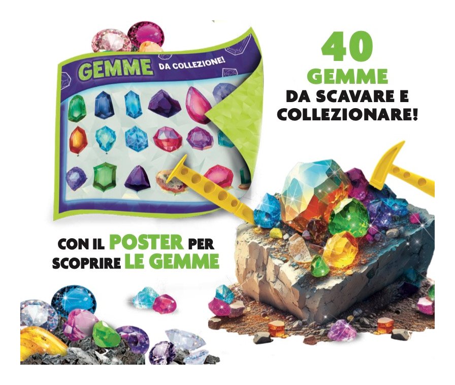 All’interno troverai un grande blocco di gesso da scavare con gli attrezzi inclusi, per portare alla luce ben 40 gemme. Incluso, il poster illustrato ricco di curiosità, per conoscere da vicino le caratteristiche e i segreti delle pietre preziose del nostro pianeta