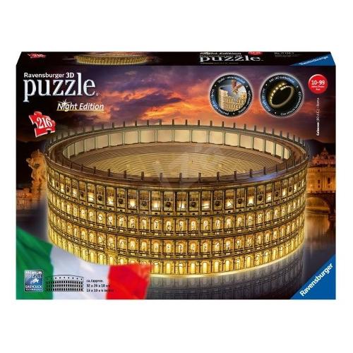 Puzzle 3d - building night edition - colosseo - ravensburger puzzle 3d building con led - night special edition - 216 pezzi. Il famosissimo monumento diventa un puzzle 3d building che si illumina al buio. grazie alla luce led posizionata sulla base, la costruzione diventa di tantissimi e bellissimi colori scintillanti. 216 pezzi + accessori. Dimensione finale: 47 x 14 x 7 cm. Puzzle 3d building ravensburger. edifici perfettamente stabili realizzati con veri pezzi di puzzle. pezzi in fibra plastica super-resistente di varie forme. si assemblano senza l'uso di colla, forbici o altri utensili, sono perfettamente stabili e rappresentano fedelmente in ogni singolo pezzo tutti i dettagli del monumento. made in germany – original ravensburger quality. All'interno supporto per ambientazione. Accessori per rendere perfetta e completa la tua costruzione. 216 pezzi di puro divertimento ravensburger. alimentazione tramite 3 pile stilo da 1,5 volt tipo aa-lr6-um3 non incluse nella confezione.