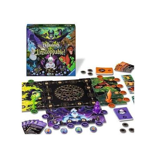 In Disney Villainous Unstoppable! vestirai i panni di uno dei quattro iconici cattivi Disney: Malefica, Ursula, Ade o Scar. Ogni giocatore dovrà sfruttare al meglio le proprie abilità speciali per completare il proprio piano malvagio, ostacolando al tempo stesso i progressi degli altri villain. Un gioco strategico e competitivo, che ti trasporta in un universo narrativo unico, dove ogni regno riflette l'essenza del personaggio che rappresenti. I giocatori si muovono su un tabellone condiviso composto da quattro regni distinti, uno per ciascun cattivo. Durante il proprio turno, ciascun giocatore può eseguire azioni collegando i simboli delle carte alla posizione sul tabellone, per avanzare nel proprio piano, guadagnare potere, contrastare gli avversari o sconfiggere eroi. Alla fine del turno si pescano carte fino ad averne quattro in mano. Vince chi riesce per primo a completare i quattro gettoni che compongono il proprio piano malvagio.
