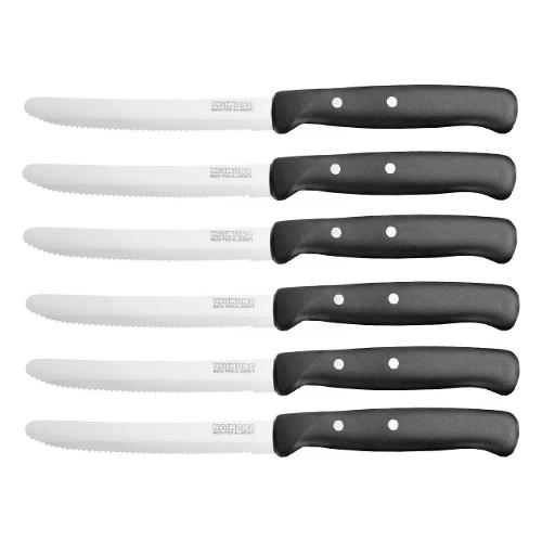 Coltello da tavola a punta arrotondata con dentatura speciale larga e delicata. Profilo della lama e dentatura disegnati appositamente per tagliare tutti i cibi cotti e crudi e sbucciare la frutta sulla tavola.