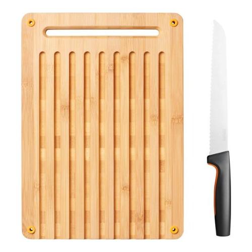 Il set tagliere per pane in bambù e coltello per pane di fiskars è perfetto per gli amanti del pane: un tagliere scanalato e un coltello con una lama lunga e seghettata perfetta per tagliare il pane con crosta dura. Il tagliere scanalato in bambù con piedini in silicone antiscivolo ha dei solchi per raccogliere le briciole e rendere la pulizia più semplice. Entrambi i lati del tagliere sono stati realizzati con bambù certificato 100% fsc® (fsc-c108780) e trattati con olio di lino. Il tagliere ha inoltre un lato piatto, perfetto per la preparazione di tanti tipi di alimenti. L’impugnatura ergonomica e l'inserto in softgrip™ in corrispondenza delle dita, la resistente lama in acciaio inox giapponese e la profonda protezione per le dita rendono questo coltello sicuro e comodo. Come tutti i coltelli functional form, può essere lavato in lavastoviglie e, grazie al profilo sottile, è facile da riporre.