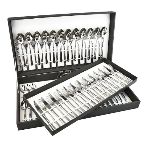 Servizio 75 pz include: 12 cucchiai, 12 forchette, 12 coltelli tavola, 12 forchetta frutta, 12 coltelli frutta, 12 cucchiaini caffè. 1 mestolo, 1 cucchiaione e 1 forchettone da servizio