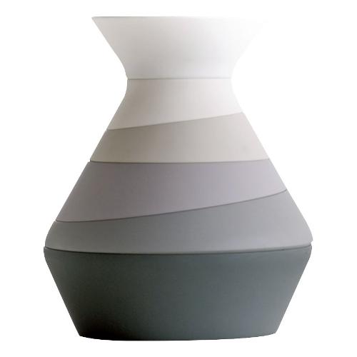 Quando impilati, i contenitori si trasformano in un unico oggetto compatto dalla forma morbida, che funge da centrotavola ed elemento decorativo. Realizzati in tecnopolimero alimentare, presentano sei diverse tonalità di grigio, che ne facilitano l’impilabilità e creano un piacevole effetto visivo. Le linee di taglio inclinate richiamano le venature naturali di un ciottolo di fiume, aggiungendo un tocco organico ed elegante al design.