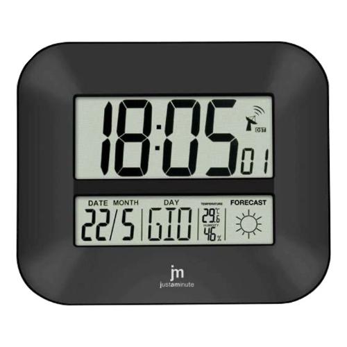 Orologio da parete/tavolo radiocontrollato con previsione delle condizioni meteo per le successive 12/24 ore. Funzione sveglia con snooze (ripetizione dopo 5 minuti). Indicazione della temperatura e dell’umidità interna. Calendario (giorno/mese/anno) con giorno della settimana disponibile in 7 lingue (italiano, francese, inglese, tedesco, spagnolo, olandese, danese).