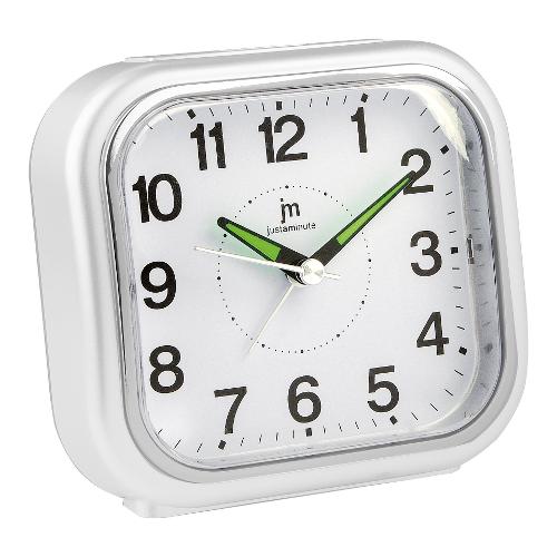 Sveglia al quarzo analogica con luce, snooze (ripetizione dopo 5 minuti) e suoneria su campana metallica. Movimento continuo silenzioso.