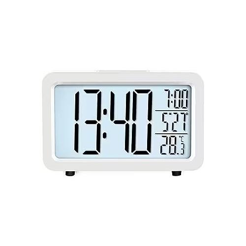 Sveglia digitale radiocontrollata con rilevazione della temperatura interna. Allarme con snooze e crescendo. Calendario. Luce bianca elettroluminescente.