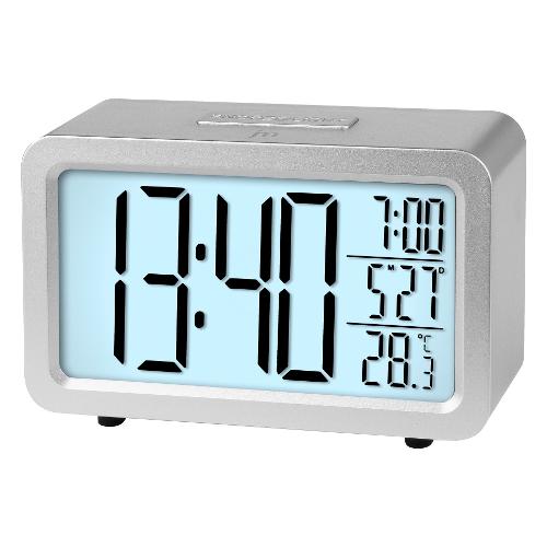 Sveglia digitale radiocontrollata con rilevazione della temperatura interna. Allarme con snooze e crescendo. Calendario. Luce bianca elettroluminescente.