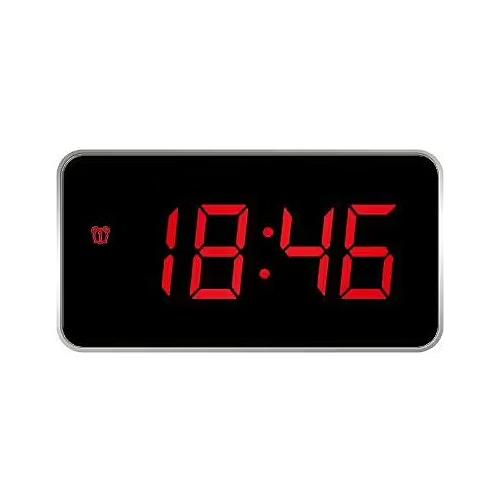 Sveglia digitale alimentata a corrente. Funzioni: doppio allarme con snooze (ripetizione dopo 9 minuti), riserva di carica tramite batterie (2 x AAA non incluse), Led rossi altezza 3 cm (1.2”), luminosità regolabile (3 livelli), display 24 h. Silenziosità assoluta. Adattatore incluso