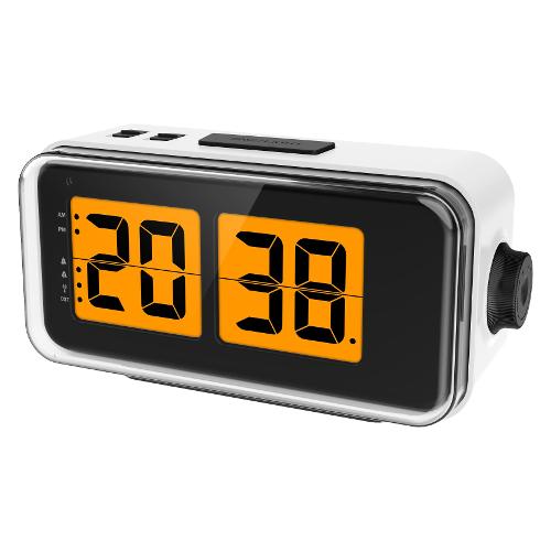 Sveglia radiocontrollata (DCF) con cartelle digitali. Possibilità di effettuare la messa a punto manuale. Doppio allarme con Snooze. Calendario (Giorno, Mese, Anno). Luce elettroluminescente a spegnimento ritardato. Possibilità di visualizzare la temperatura interna attivando loop alternato di orario, calendario e temperatura. Sensore crepuscolare che consente illuminazione automatica display in presenza di buio (disattivabile). Possibilità di applicazione a parete. Pulsante/rotella laterale per messa a punto.
