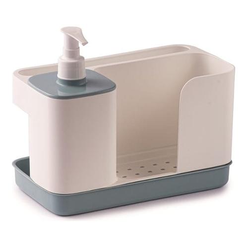 In un unico prodotto: dispenser per sapone liquido o detersivo per i piatti, vano per spugne e guanti, supporto per panni e strofinacci.