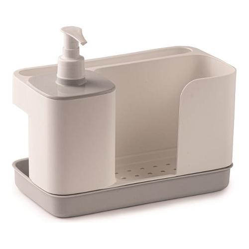 In un unico prodotto: dispenser per sapone liquido o detersivo per i piatti, vano per spugne e guanti, supporto per panni e strofinacci.
