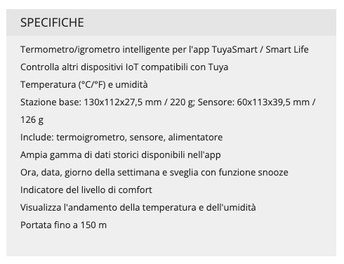 Stazione meteorologica intelligente Multi-channel con sensore wireless Tuya è dotato di una tecnologia intelligente che controlla automaticamente il riscaldamento o il deumidificatore per mantenere una temperatura e un'umidità confortevoli in casa. Ciò si ottiene utilizzando la tecnologia IoT (Internet of Things). Questo termoigrometro intelligente è l'aggiunta perfetta a un sistema di casa intelligente alimentato da Tuya , la piattaforma IoT leader a livello mondiale. Con l'app TuyaSmart o Smart Life, puoi collegare i tuoi elettrodomestici e creare la tua casa intelligente . Come parte di questo sistema, il termoigrometroaiuta a mantenere un ambiente confortevole all'interno della vostra casa. Fino a 7 sensori (1 incluso, 6 opzionali) possono trasmettere i dati di misurazione alla stazione base a una distanza di 150 m , da dove i dati vengono trasmessi tramite Wi-Fi all'app.