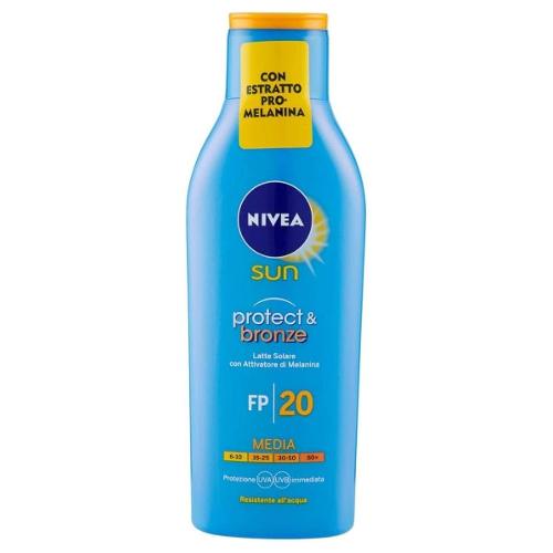 Il latte solare nivea sun protect & bronze con attivatore di melanina garantisce una protezione efficace ed un"abbronzatura intensa e dorata. Contiene un estratto vegetale che favorisce la produzione naturale di melanina, responsabile dell"abbronzatura e della protezione della tua pelle. L"efficace sistema di filtri uva/uvb protegge la pelle immediatamente dopo l"applicazione. Resistente all"acqua.