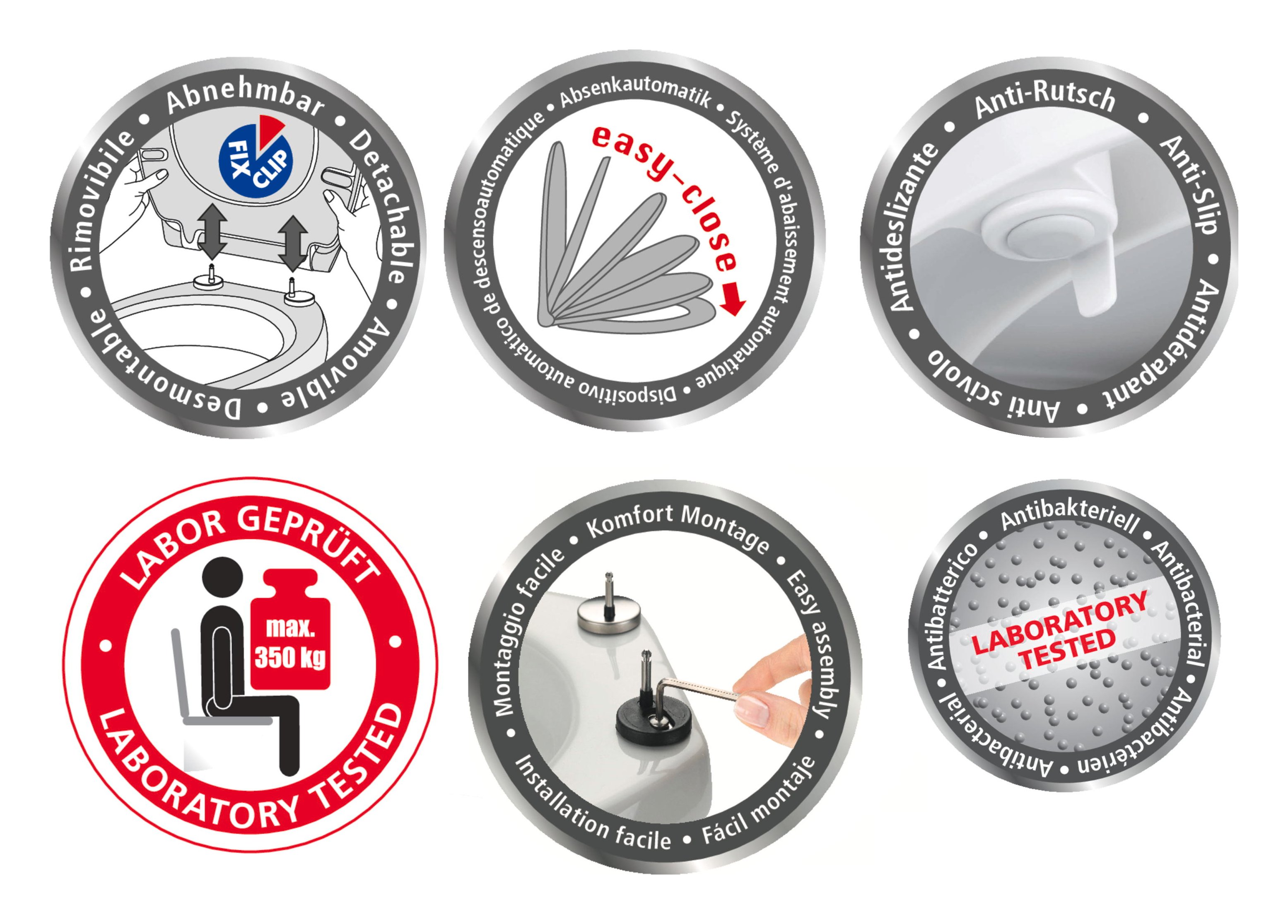 Sedile wc 350 kg portata certificata da un laboratorio accreditato! Antigraffio. Con pulsante fix-clip per facilitare la pulizia e inserto gommato antiscivolo e i paracolpi con supporti laterali extra robusti che evitano ogni movimento del sedile sulla tazza del wc. Cerniere in acciaio inox con chiusura ammortizzata automatica easy-close. Incluso paracolpi.