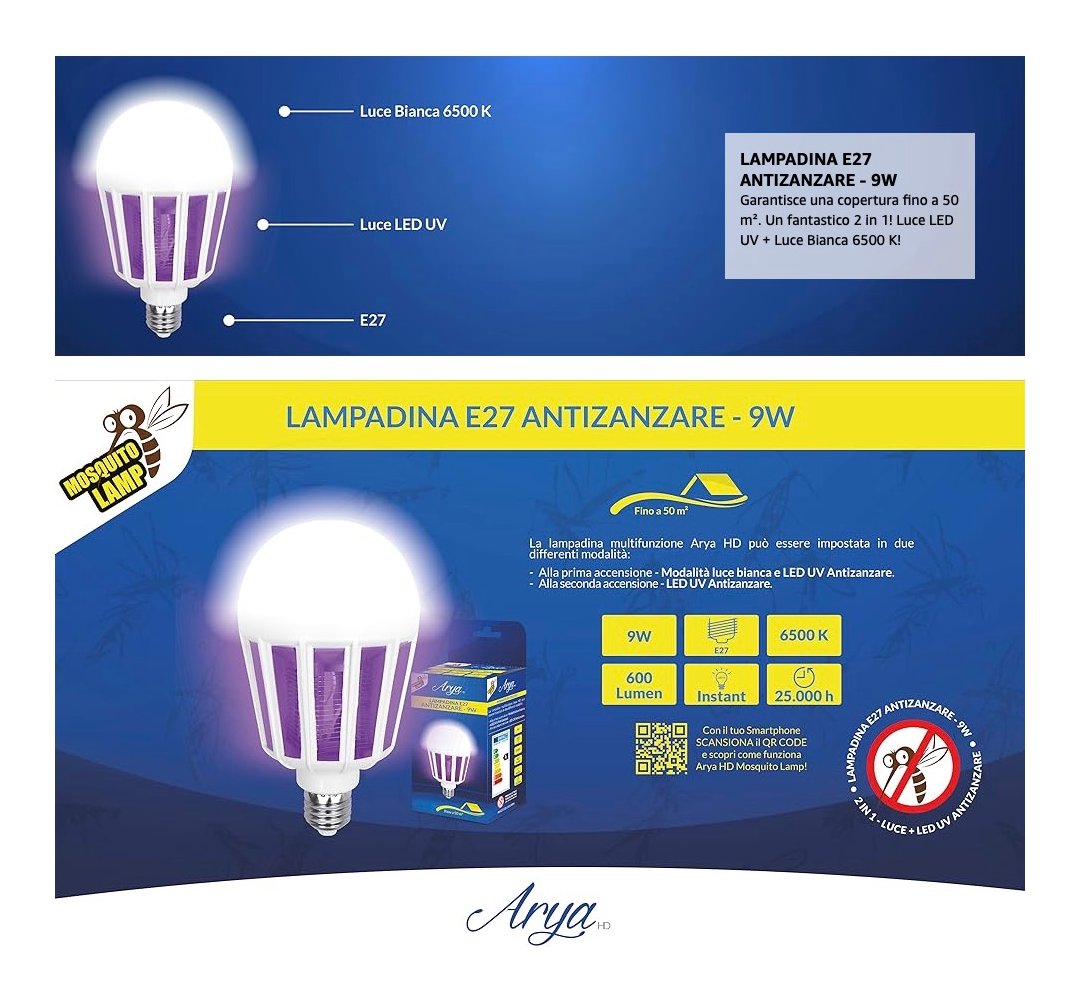 Grazie a Mosquito Lamp e alla combinazione della luce LED UV Antizanzare + luce bianca potrai proteggerti efficacemente dalle zanzare! Ideale sia per esterno che interno.Mosquito Lamp è dotato di una luce LED UV antizanzare che emette un fascio luminoso a 360 ° che attira e elimina efficacemente le zanzare intorno a te