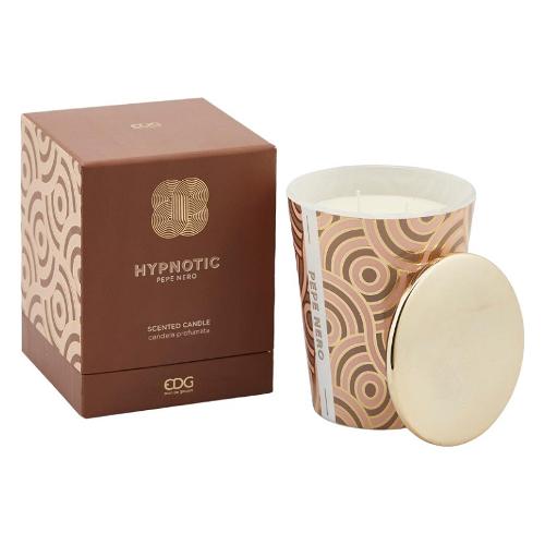Candela hypnotic pepe nero con coperchio della collezione “midnight garden” di enzo de gasperi, realizzata con esterno in ceramica decorata e caratterizzata al suo inetrno da una fragranza dal sapore orientale, con accordo di note agrumate, date dall’Arancio e dal Bergamotto e note speziate date dal Pepe Nero, della Noce Moscata e della Cannella.