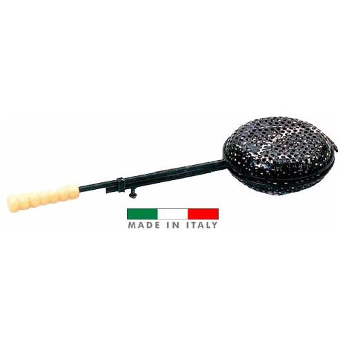 padella piccola per cucinare le castagne con manico in ferro, realizzata in acciaio per durare nel tempo, dotata di un lungo manico che consente di muovere le castagne in tutta sicurezza durante la cottura sopra il fuoco.