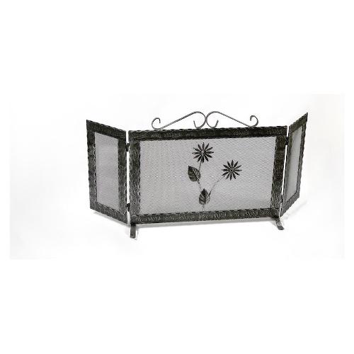 Parascintille margherita in ferro battuto massiccio, ideale per un gran camino, composto da un panello con 2 piedini e 2 antine laterali pieghevoli.