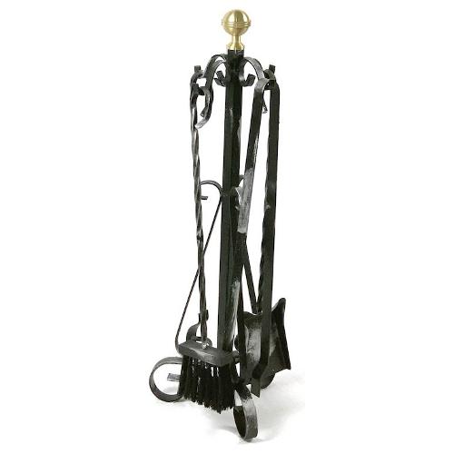 Kit attrezzi per caminetto realizzati in ferro battuto con pomello ottone completi di paletta, scopetta, pinza, tirabraci.