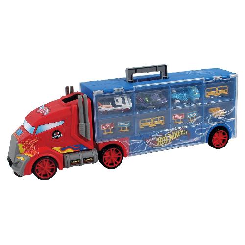 Valigetta camion bisarca porta veicoli apribile su due lati con pratica maniglia e scivolo per auto. Include 3 veicoli originali Hot Wheels a ruote libere e 4 segnali stradali