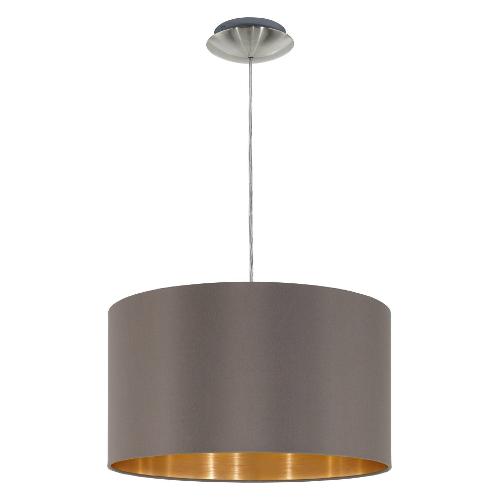 La lampada a sospensione MASERLO è composta da una base in metallo nichelato opaco e un paralume rotondo in tessuto color cappuccino e interno oro. Il paralume ha un diametro di 38 cm. Posizionalo sopra al tavolo da pranzo e goditi la cena sotto una calda luce
