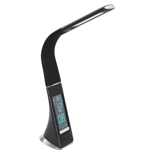La lampada da scrivania a LED COGNOLI è realizzata in plastica nera con dettagli color cromo. I LED integrati emanano una luce bianca neutra ideale per lavorare. Grazie al collo flessibile, si potrà illuminare in un batter d’occhio la postazione di lavoro in modo mirato. Questa lampada da scrivania dispone di un dimmer touch a 3 livelli. Oltre a disporre di funzioni utili quali l’indicazione dell’ora, della temperatura e della data, questa lampada conquista anche per la funzione sveglia con varie suonerie. Con il suo aspetto moderno e gli attraenti dettagli in plastica, che ricordano delle cuciture decorative in pelle, questa lampada è un pezzo immancabile, pratico e al contempo decorativo per la postazione di lavoro, che sia in ufficio o sulla scrivania di casa