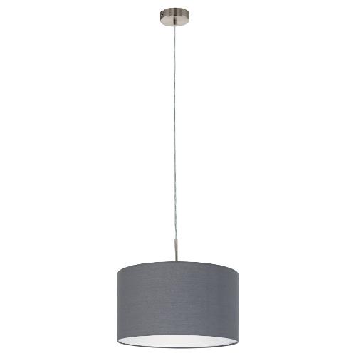 PASTERI è formata da una base in metallo nichelato e da un paralume rotondo in tessuto grigio. Questa lampada a sospensione ha un design semplice che si abbina perfettamente ad interni moderni o più rustici. Il paralume ha un diametro di 38 cm. É ideale per illuminare il tavolo da pranzo. Il paralume in tessuto rende la luce soffusa, creando atmosfera avvolgente per tutte le tue cene
