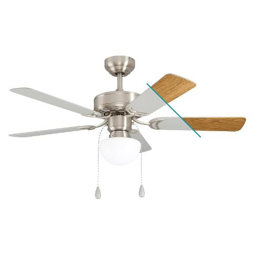 Le 5 pale in MDF del ventilatore CADIZ sono rovesciabili e disponibili alternativamente in argento o con una struttura in legno in aspetto di rovere. Il supporto per il soffitto in nichel opaco perfezionano il look classico di questo modello. I 3 livelli di velocità e la luce possono essere impostati separatamente tramite un interruttore a strappo. L'interruttore sull'alloggiamento regola il passaggio dalla modalità estiva a quella invernale. Supporta una lampadina con attacco E27.