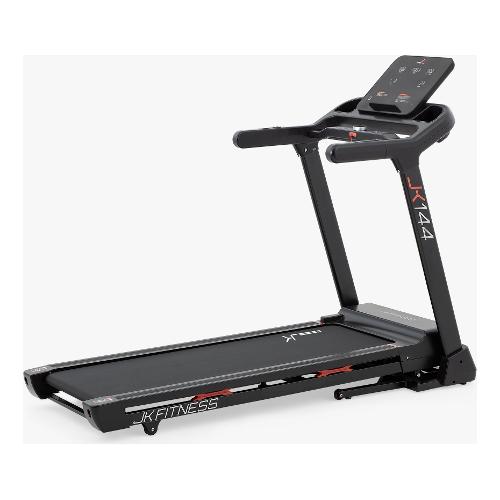 Il jk 144 è un tapis roulant elettrico di fascia media nel mondo home fitness equipaggiato con un potente motore da 3.25 hp con un picco massimo di 4.25 hp che permette di raggiungere una velocità di 22 km/h, con regolazione ad incrementi one-step di 0,1 km/h. Il jk 144 è dotato di una inclinazione elettrica su 20 livelli, che permette di raggiungere una pendenza del 12% per stimolanti camminate in salita. Per la massima facilità d’uso dell’utilizzatore il jk 144 è dotato di una serie di pulsanti a comando rapido per velocità ed inclinazione, pratici per far eseguire repentine variazioni della prestazione all’utilizzatore senza distrazioni. L’ampia superficie di corsa di 48 x 149 cm, con nastro spesso 1,6 mm anti-slip, permette confortevoli allenamenti in piena sicurezza grazie anche al sistema di ammortizzazione comfort flex system con 4 elastomeri a x, che riesce a limitare i piccoli microtraumi dovuti all’impatto del piede durante la camminata e la corsa. Il quadro di comando del nuovo jk 144 è suddiviso su due distinti elementi; una grande console con 5 display a led bianchi e una matrice grafica 8 x 16 pxl, per tenere sotto controllo tutti i parametri dell’allenamento cardio quali: tempo, distanza, velocità, inclinazione, calorie bruciate, n° passi, frequenza cardiaca, matrice grafica per visualizzazione profilo programma; una console secondaria multifunzione, start-stop e display con doppio led bianco che visualizza tempo, distanza, calorie, inclinazione e velocità. Il tapis roulant jk 144 è dotato di due ricevitori integrati: per collegare i propri devices elettronici (app, social e musica); e 5.3 kh per la rilevazione della frequenza cardiaca tramite la fascia cardio toracica offerta di serie. Il tapis roulant jk 144 si adatta perfettamente alle esigenze e necessità di ogni utilizzatore, è equipaggiato con una serie di programmi per rendere ogni allenamento completamente personalizzato! Sono in dotazione: 1 programma manuale dove tutte le funzioni sono interamente gestite dall’utilizzatore in ogni momento; 3 programmi a target con obiettivi pre-determinati per un tempo, una distanza, il consumo di calorie; 70 programmi pre-impostati con la variazione combinata fra velocità ed inclinazione; hrc target determinato dall’utente della frequenza cardiaca personale; 5 user programmi personalizzabili dall’utilizzatore stesso, ovvero bisogna impostare ogni singolo step del programma determinando velocità ed inclinazione; 1 body fat test, utile a comprendere la proprio indice di massa corporea. La console è dotata di due casse audio hi-fi, due vani porta borraccia/oggetti, un ingresso audio usb, ingresso audio jack, una uscita usb per ricaricare i propri dispositivi durante l’allenamento. E’ possibile connettere alcune app divertenti per rendere le sessioni di allenamento interattivo, quali: zwift, kinomap (abbonamenti non inclusi).