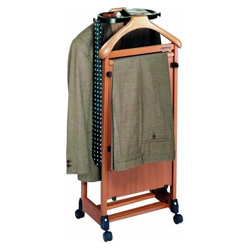Pratico e funzionale, ha due spalle per appendere giacche e camicie, una staffa porta pantaloni e un'altra con ganci regolabili per appendere le gonne, vaschetta porta oggetti con ganci per appendere cravatte e cinture, una comoda base porta scarpe e ruote piroettanti antigraffio per facilitare gli spostamenti.
