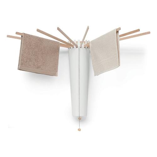 Lo stendipanni tub8 di foppapedretti è uno stendino da parete con 8 raggi estraibili contemporaneamente, in legno massiccio di faggio verniciato naturale. La struttura in legno è rivestita in materiale abs di colore bianco per adattarsi all'arredamento di ogni casa