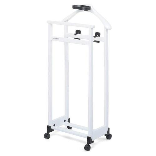 Ha una spalla per giacche e camicie, una staffa porta pantaloni con pinze regolabili per appendere le gonne e una base porta scarpe. Si sposta facilmente grazie alle ruote piroettanti antigraffio e ha anche una vaschetta porta oggetti.