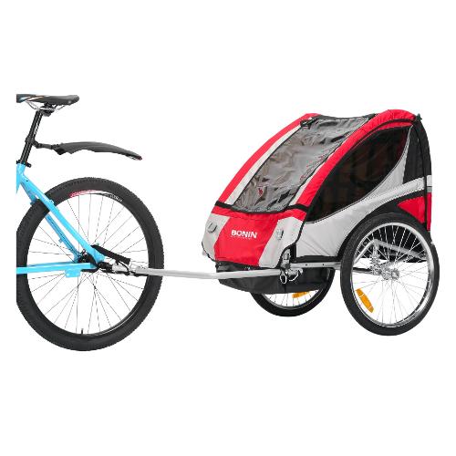Carrellino bonin 'ncab dlx porta bimbo/jogging/passeggino, colore rosso/grigio/nero, con funzioni jogging e passeggino, telaio in acciaio, attacco universale al mozzo posteriore adatto alla maggior parte delle comuni biciclette. Dotato di ammortizzatori e ruota anteriore del 12x1.75 pivotante con funzione di bloccaggio. Ruote posteriori da 20x1.75. Omologato alla circolazione stradale con il montaggio di una luce posteriore autorizzata, cintura di sicurezza a 5 punti, freno di stazionamento su entrambi i lati. Bandierina di sicurezza ben visibile.