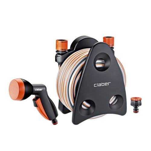 Compatto portatubo accessoriato pronto all’uso. Dotato di maniglia a scomparsa che consente di facilitarne il trasporto e l’appoggio. Appendibile al muro. Può essere riposto in modo ordinato grazie alle comode sedi per l’alloggiamento dei raccordi, della presa e della pistola. Include: 10 m tubo da 9-13 mm, 1 presa 3/4” (20-27 mm) con riduzione 1/2” (15-21 mm), 2 raccordi automatici, 1 pistola a doccia.