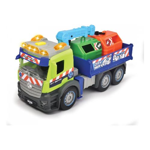 Action truck recycling – camion con cestino per la raccolta differenziata, gru, effetti sonori e spia luminosa, funzione di carico/scarico. Questo camion per il riciclaggio di dickie toys è un modo divertente per insegnare al tuo piccolo l'importanza del riciclaggio. Il veicolo è inoltre dotato di due contenitori per la raccolta differenziata di carta/cartone e vetro. Una volta che i cassonetti sono pieni, apri semplicemente le colonne di supporto sul veicolo e ripiega le sponde. I bidoni possono quindi essere sollevati sul veicolo utilizzando il braccio della gru girevole, pronti per lo scarico al centro di riciclaggio! Il camion è modellato su un Mercedes Actros e presenta un grande logo Mercedes. Dispone inoltre di un motore a frizione integrato, che spinge il veicolo per diversi metri quando viene spinto.