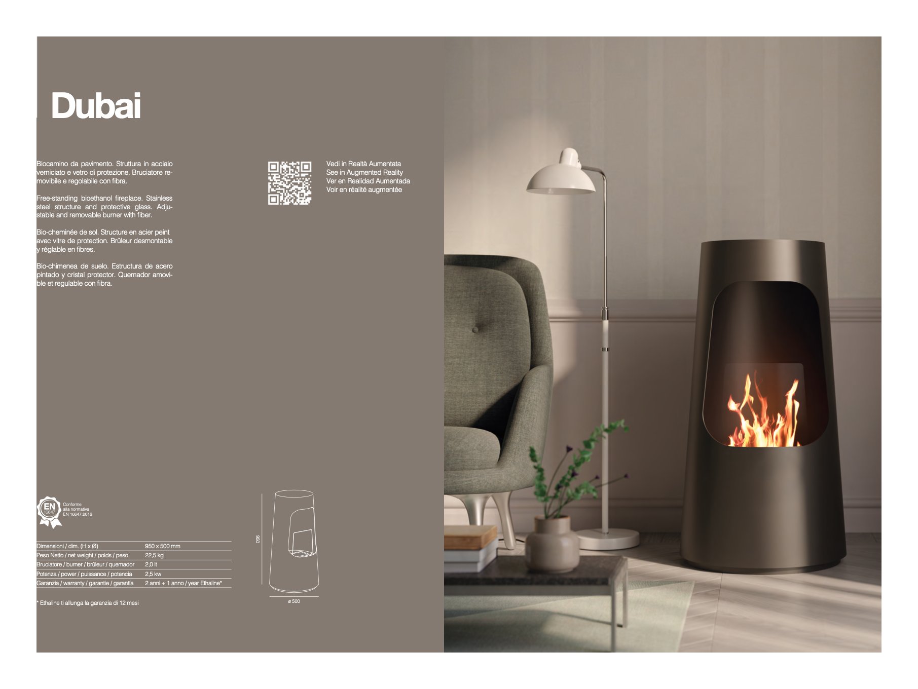 Biocamino da pavimento Dubai colore nero in acciaio verniciato. Questo camino alimentato a bioetanolo di Tecno Air System è un vero caminetto ecologico dalle forme semplici e pulite. Adatto a chi cerca una componente d'arredo in ottica contemporanea per arredare casa rendendola più accogliente.