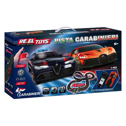 Pista elettrica con 4 possibili tracciati, con dotazione 2 auto 1:43 alfa romeo giulia quadrifoglio carabinieri e bugatti con luci e funzione turbo. Include parti di ricambio e alimentatore rete domestica