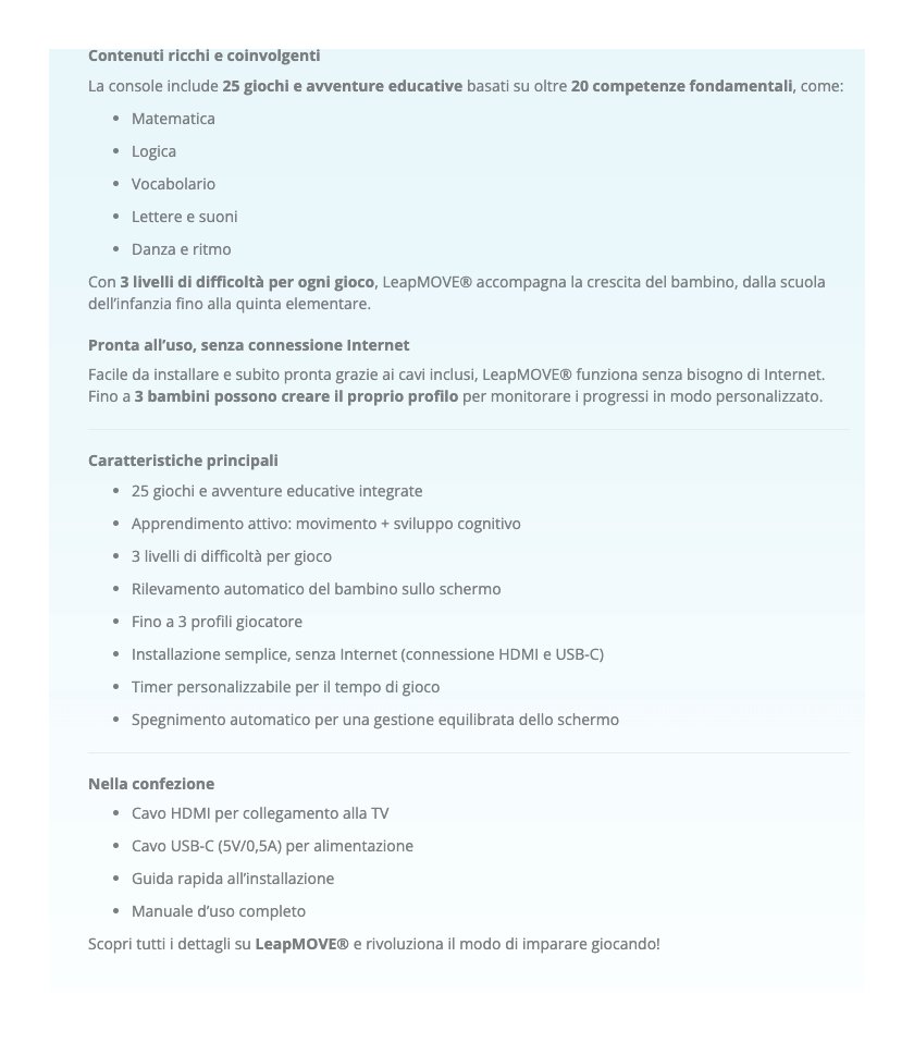 LeapMOVE è una vera innovazione nel mondo del gioco educativo: pensata per i bambini dai 4 agli 11 anni, trasforma ogni movimento in un’opportunità per imparare, divertirsi e restare attivi, direttamente davanti alla TV. Senza controller: basta il corpo per giocare!