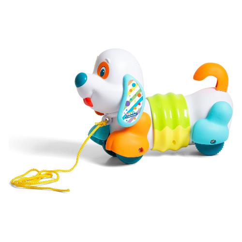 Un dolcissimo cagnolino trainabile che diventerà un inseparabile compagno di giochi dei più piccoli! Il cagnolino cammina in modo simpatico e buffo grazie al corpo snodabile e alle zampe che si muovono davvero! Quando si muove il cagnolino riproduce un divertente suono. Sviluppa la percezione sensoriale, la coordinazione motoria e la fantasia del bambino.