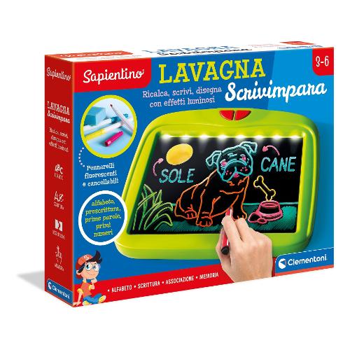 Una speciale lavagna dotata di un piano trasparente con luci led rgb e pennarelli fluorescenti per divertirsi a disegnare e approcciarsi alla scrittura. Inserendo le schede illustrate sotto il piano trasparente il bambino potrà fare giochi di prescrittura, imparare a scrivere le lettere dell'alfabeto e nuove parole, con la tecnica del ricalco. Si possono ricalcare i disegni inclusi nella confezione o disegnare e scrivere liberamente, per poi scoprire al buio l'effetto magico delle luci sulla propria creazione. Un gioco perfetto per stimolare la manualità, l'attenzione e la creatività, per imparare a scrivere e sviluppare il linguaggio.