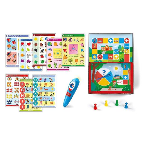 Un compendio di quiz ed attività educative studiato per i primi anni della scuola dell'infanzia. Con la penna interattiva si potranno risolvere tanti quiz a tema forme, colori, alfabeto, numeri. 8 schede educative e 16 attività di gioco per esercitare la logica e potenziare le competenze, in linea con i programmi delle scuole dell’infanzia. La penna segnala le risposte giuste con suoni e luci, in questo modo il bambino è in grado di progredire nel gioco in autonomia. Gioco educativo pensato per bambini in età prescolare.