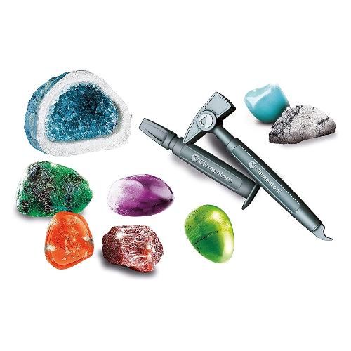 Un kit scientifico per riportare alla luce bellissime pietre preziose e minerali. Il set contiene un mattone da scavare per estrarre gemme e pietre da collezionare. Uno stampo per riprodurre un affascinante geode da impreziosire con cristalli colorati e brillanti. Nel ricco manuale scientifico si potranno scoprire tutti i segreti della mineralogia e le reazioni chimiche dei sali! Made in italy