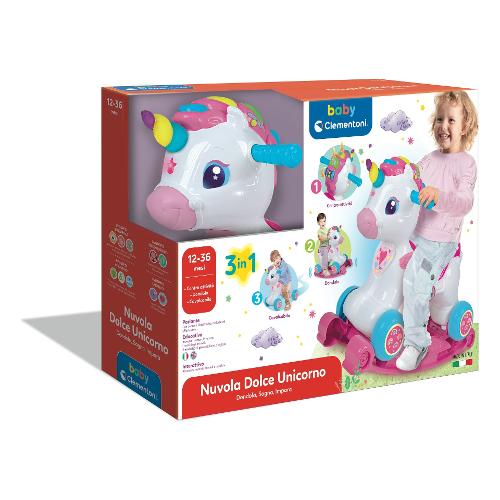 Un dolce unicorno 3 in 1 che è dondolo, cavalcabile e centro attività interattivo! Nuvola grazie ad un sensore, riconosce l'attività del movimento e intrattiene il bambino con effetti sonori realistici, simpatiche frasi e canzoncine. I tasti sulla criniera insegnano lettere, versi e nomi degli animali mentre è possibile imparare i numeri grazie al rullo girevole. Ricco di canzoncine e simpatiche filastrocche. Stimola la motricità, lo sviluppo affettivo e del linguaggio. Made in italy