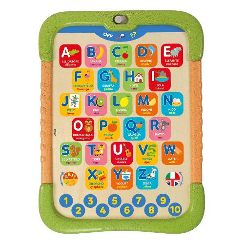 Un alfabetiere elettronico per scoprire l'alfabeto e i numeri. Si può giocare sia in italiano che in inglese. Con tre diverse modalità di gioco permette al bambino di conoscere le lettere, il loro suono e le prime parole, i numeri e le quantità. È possibile divertirsi ad ascoltare suoni divertenti e provare a rispondere ai quiz. Il gioco ha un pannello interattivo in vero legno, la plastica del rivestimento contiene fibre di legno che gli conferiscono un piacevole aroma naturale. Con più di 350 contenuti, è perfetto per avvicinarsi all'alfabeto e scoprire nuove parole, stimolando la curiosità e la memoria dei più piccoli.