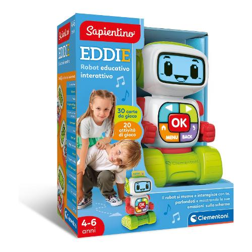 Un simpatico robot interattivo ed emotivo per giocare e divertirsi! 30 carte fronte/retro e 20 attività educative per imparare tante nuove cose: lettere, numeri, emozioni, strumenti musicali e forme geometriche. Lo schermo lcd con tantissime animazioni e il motore elettrico rendono il robot vivo ed empatico. Grazie al lettore elettronico, eddie riconosce tutti i soggetti delle carte e può interagire con il bambino. Eddie sarà il miglior compagno di giochi dei bambini dai 4 ai 6 anni.