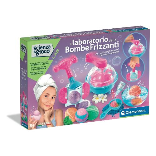 Un vero e proprio laboratorio con tutti gli strumenti e le sostanze chimiche e cosmetiche necessarie per creare bombe da bagno frizzanti, colorate e profumate. Il kit permette di miscelare le sostanze e modellarle per realizzare bath bombs personalizzate e speciali. Il ricco kit contiene bicarbonato di sodio, acido citrico, coloranti, aromi e strumenti come mixer, dosatore e presse con stampini di diverse forme. Adatto a bambini a partire dagli 8 anni in su. Progettato e realizzato in italia.