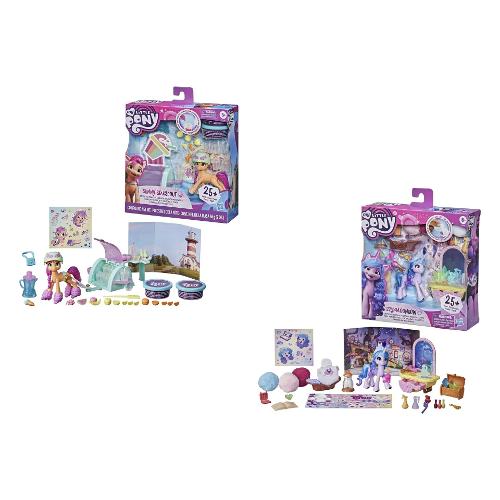 Dai sfogo alla tua creatività con i set Scene e Accessori! Ogni set include un personaggio pony da 7,5 cm con punti di snodo e capelli sagomati (ciascuno venduto separatamente, secondo disponibilità). Ogni set include oltre 25 accessori ispirati al personaggio per ispirare momenti di narrazione e personalizzazione. I bambini e le bambine possono realizzare animaletti fai-da-te o frullati giocattolo. I set includono anche uno sfondo per la storia ispirato al film ""My Little Pony: Una Nuova Generazione"". Cerca i giocattoli Scene e Accessori Izzy Moonbow e Sunny Starscout per bambini e bambine dai 5 anni in su (ciascuno venduto separatamente, secondo disponibilità). My Little Pony e tutti i personaggi correlati sono marchi commerciali di Hasbro.