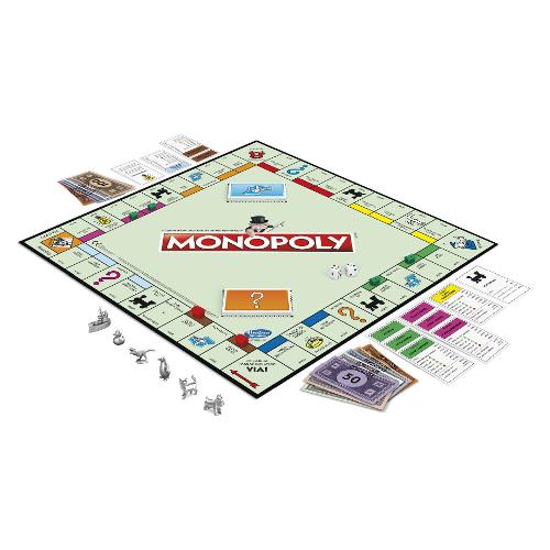 Monopoly, il gioco di contrattazione più famoso del mondo. Scopo del gioco è diventare monopolista, ossia restare l’ultimo “finanziere” in partita dopo che tutti gli altri hanno fatto bancarotta. Al proprio turno, ogni giocatore lancia i dadi e si avventura sul tabellone, fra l’acquisto di terreni, stazioni o società, il pagamento di affitti e la costruzione di case e alberghi, le sorprese rappresentate dalle carte degli imprevisti e delle probabilità, e il rassicurante ritiro dello stipendio ogni volta che, completato un giro, si passa dal VIA. Quando un giocatore non ha denaro o proprietà a sufficienza per pagare un affitto o onorare un debito nei confronti della banca o di un altro giocatore, va in bancarotta ed esce dal gioco. Chi riesce ad amministrare al meglio le proprie finanze, bilanciando gli investimenti con una saggia disponibilità di contanti per affrontare qualsiasi traversia, vince la partita.